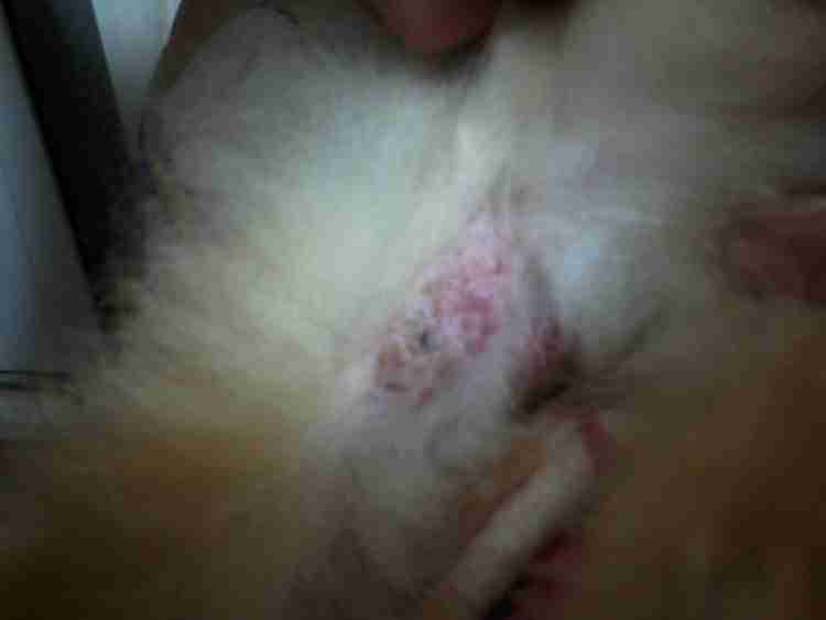 前几天太阳好,我带它们到草地上去玩,结果,今天才发现皮蛋的后腿已经成这样了,是虫咬的还是什么皮肤病 啊,我明天一早带去宠物医院看