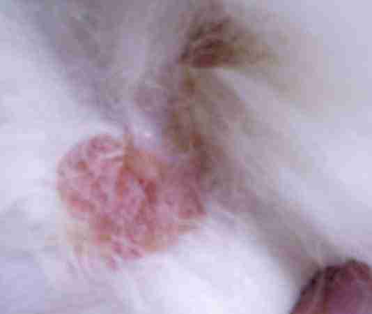第一次发帖子 我刚养了一天的狗狗 发现在尾巴根处 后被的底端 有两块没有毛的地方 红红的 我拿手摸了摸 有一块很光滑 有一块稍微有点小痘痘似地 这是皮肤病吗 大家帮帮我 谢谢